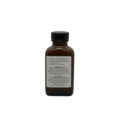 Our exfoliating scrub brings together powerful botanical ingredients like sugar, lavender buds, kaolin clay, ashwagandha root powder, and grapeseed oil to deliver a spa-like treatment in your own home. Sugar crystals effectively remove dry and dead skin cells, while lavender buds soothe and calm the skin as you exfoliate. Kaolin clay activates upon contact with water, detoxifying pores and removing impurities for a refreshingly clean feel.